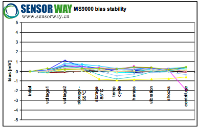對(duì)于量程為±10g 的測量,它們總的長期零偏穩(wěn)定性優(yōu)于 7.5mg,對(duì)于量程±5g,優(yōu)于 3.75mg,其標(biāo)度因數(shù)重復(fù)性優(yōu)于 400ppm。圖 1 顯示了對(duì)于各種量程 MS9000.D 的一年零偏穩(wěn)定性的測量結(jié)果。該分析結(jié)果還包括:在 85°時(shí)進(jìn)行10天的加速老化實(shí)驗(yàn),這對(duì)應(yīng)于 18 個(gè)月的標(biāo)準(zhǔn)壽命時(shí)間,以及對(duì)加速度傳感器為期 0.2 毫秒,1000g 的從六個(gè)方向進(jìn)行的沖擊。