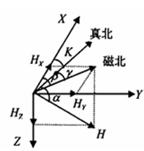 HMC的輸出電壓為磁場(chǎng)強(qiáng)度為0時(shí)傳感器的輸出。所以當(dāng)U0為0時(shí), Uout正比于磁場(chǎng)強(qiáng)度B。如圖4,假設(shè)機(jī)器人處于水平面上,X為機(jī)器人行進(jìn)方向,Y為水平面上垂直X的方向向右(即X順時(shí)針轉(zhuǎn)90),地里北極方向和地磁北極方向如圖所示。H為地磁場(chǎng),Hx、Hy分別是H在X、Y方向的水平分量, β為機(jī)器人行進(jìn)方向和地磁北極方向的夾角, γ為地磁北極和地理北極方向的夾角,K就是機(jī)器人行進(jìn)方向與地理北極方向之間的夾角,也就是我們最終要求的角度。(此處的β、γ、 K都是由前者出發(fā)順時(shí)針到達(dá)后者的角度)由圖可明顯看出,K= β-γ。而在地球上不同方位的γ可查表得出,所以關(guān)鍵就是求得 。由磁阻傳感器可以得出Hx、Hy,(此處忽略了機(jī)器人在Z軸方向的傾斜,所以二維傳感器就夠用了),