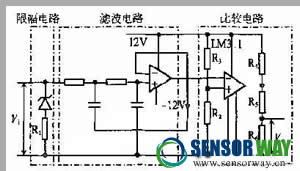 根據(jù)輪速傳感器信號(hào)特性,處理電路由限幅電路、濾波電路和比較整形電路組成,如圖所示。