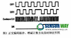 正交編碼脈沖電路的方向檢測(cè)邏輯決定了兩個(gè)脈沖序列中哪一個(gè)是先導(dǎo)序列,接著它就產(chǎn)生方向信號(hào)作為通用定時(shí)器的計(jì)數(shù)方向輸入,兩列正交輸入脈沖的兩個(gè)邊沿都被正交脈沖編碼電路計(jì)數(shù),因此,產(chǎn)生的時(shí)鐘頻率是每個(gè)輸入序列的4倍,且把這個(gè)時(shí)鐘作為通用定時(shí)器2或4的輸入時(shí)鐘。圖3給出了正交編碼脈沖、增減計(jì)數(shù)方向及時(shí)鐘的波形。