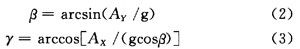 當(dāng)加速度計(jì)被定向,那么它的X和Y軸就和地球表面平行可用來作為具有翻滾和傾斜兩個(gè)軸的雙軸斜度傳感器,被測(cè)物體的俯仰角記為γ和橫滾角β。將磁阻傳感器的3個(gè)敏感軸沿載體的3個(gè)坐標(biāo)軸安裝,分別測(cè)量地磁場(chǎng)磁感應(yīng)強(qiáng)度H在載體坐標(biāo)系3個(gè)坐標(biāo)上的投影分量(HX,HY,HZ),然后利用俯仰角和橫滾角進(jìn)行姿態(tài)解算就可以得到電子羅盤的方位角。