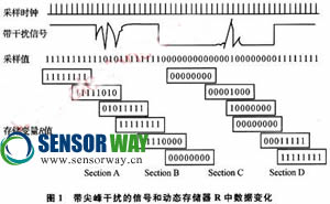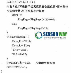 在圖1中,從正常下降沿過程(Section B),可以看到變量R中的數(shù)據(jù)經(jīng)歷了從各位全為1,到1、0共存,再變化到全為0的過程;然而,在高電平段的干擾部分(SectionA),變量R經(jīng)歷了從全為1,到1、0混合,再回到全為1的過程。類似地,正常上升沿(Section D)變量R經(jīng)歷了各位全為0,到0、1共存,再變化到全為1的狀態(tài)變化過程;在低電平段的干擾部分(Section C),變量R經(jīng)歷了采樣狀態(tài)從全為0,到0、1混合,再回到全為0的過程。通過判斷此4種情況下變量R中數(shù)據(jù)的不同變化過程,可以達(dá)到從正常變化中辨別出干擾的目的。這就是本設(shè)計(jì)所采用的軟件濾波抗干擾方法的基本思想。