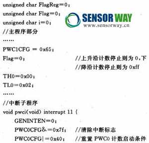 VRS51L3074單片機(jī)是由美國(guó)Ramtron(瑞創(chuàng))公司推出的8位單片機(jī)家族VRS51L3XXX系列的成員。VRSS1L3074提供了2個(gè)與定時(shí)器0和1關(guān)連的獨(dú)立的脈寬計(jì)數(shù)器(PWC)模塊,用戶可通過對(duì)PWC模塊和定時(shí)器的配置,靈活地控制定時(shí)器啟動(dòng)或停止計(jì)數(shù),從而方便地實(shí)現(xiàn)對(duì)ADXL202E輸出的脈寬和周期的計(jì)數(shù)。