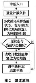 根據(jù)軟件濾波設(shè)計(jì)思想,濾波子程序由主程序在信號(hào)狀態(tài)發(fā)生變化,進(jìn)入中斷時(shí)調(diào)用,圖2給出了濾波程序流程。對(duì)照?qǐng)D1中4種Section來分析流程圖。當(dāng)有邊沿或干擾信號(hào)(信號(hào)周期大于計(jì)數(shù)時(shí)鐘周期)到來時(shí),VRS51L3074單片機(jī)的PWC計(jì)數(shù)停止條件滿足,系統(tǒng)進(jìn)入中斷服務(wù)子程序。在中斷子程序中,首先重置脈寬計(jì)數(shù)條件,然后對(duì)當(dāng)前狀態(tài)進(jìn)行采樣,采樣1次,狀態(tài)寄存器左移1位,采樣到高電平記為“1”,采樣到低電平記為“0”。如正常下降沿Section B,前面處于高電平段,初始狀態(tài)變量Flag全為1,當(dāng)出現(xiàn)低電平,控制器進(jìn)人中斷,緊接著進(jìn)行16次采樣。前已提及系統(tǒng)處理的尖峰干擾約1~2 ms,每個(gè)采樣周期約為0.4 ms,其尖峰干擾脈寬達(dá)不到8個(gè)采樣周期。系統(tǒng)設(shè)計(jì)時(shí)采樣16次,只取最后8次的存儲(chǔ)狀態(tài)與原狀態(tài)進(jìn)行比較,如果最后采樣的狀態(tài)全為“0”則與原狀態(tài)相反,就可判斷出這是1個(gè)正常下降沿。如果是干擾信號(hào)引起計(jì)數(shù)中斷,前面8個(gè)采樣狀態(tài)不全為“1”,后面8個(gè)狀態(tài)全為“1”,最后采樣的狀態(tài)與原狀態(tài)相同,就可判斷出這是1個(gè)干擾信號(hào),如Section A。在信號(hào)狀態(tài)采樣期間,計(jì)數(shù)條件滿足PWC繼續(xù)計(jì)數(shù),直到真正的下降沿到來,計(jì)數(shù)停止并保存,計(jì)數(shù)寄存器還原為初始值,這樣干擾信號(hào)即被濾除。類似地,正常上升沿Section D,存儲(chǔ)器原狀態(tài)為“0”,上升沿來臨后存儲(chǔ)器狀態(tài)為“1”,與原狀態(tài)相反,PWC計(jì)數(shù)停止并保存,計(jì)數(shù)寄存器還原為初始值,退出中斷子程序。有干擾信號(hào)出現(xiàn)后采樣狀態(tài)與原狀態(tài)相同,干擾尖峰脈沖可被濾除。如果要使脈寬計(jì)數(shù)更精確,可判斷前8個(gè)采樣周期中系統(tǒng)不正常計(jì)數(shù)的周期,然后與最終計(jì)數(shù)周期相加即可。此時(shí),程序流程體現(xiàn)出軟件濾波功能。