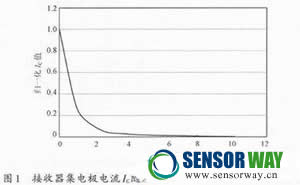 光電傳感器的輸出電流ICON是光電傳感器一個(gè)十分關(guān)鍵的參數(shù)。對(duì)槽型光電傳感器而言,在給定條件下,ICON不僅與發(fā)射器輻射強(qiáng)度Ee、接收器集電極電流IC有關(guān),還和發(fā)射器與接收器的距離以及發(fā)射器與接收器前槽縫的寬度有關(guān)。圖1為側(cè)面發(fā)光發(fā)射器與側(cè)面受光接收器之間距離改變時(shí),發(fā)射器電流10 mA時(shí)測量得到的接收器集電極電流IC隨距離的變化曲線。距離越大,相同條件下接收器集電極電流IC就越小。而發(fā)射器與接收器前槽縫的寬度越大,相同條件下光電傳感器的輸出電流ICON就越大。在槽型光電傳感器設(shè)計(jì)過程中,發(fā)射器輻射強(qiáng)度與接收器集電極電流應(yīng)結(jié)合發(fā)射器與接收器之間的距離,以及槽縫寬度進(jìn)行選取。