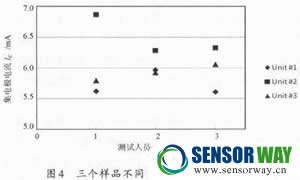 。4)測試誤差。在發(fā)射器與接收器測試過程中,由于機(jī)臺(tái)、測試人員不同,會(huì)導(dǎo)致測試結(jié)果的變差。圖4為3位測試人員在同一機(jī)臺(tái)測試相同的三個(gè)接收器樣品得到的結(jié)果。由圖可見,樣品2不同集電極電流測試值之間的最大差值甚至略高于0.5 mA.測試誤差與機(jī)臺(tái)的測量精度、測試過程中用于固定元件的夾具的精度等有關(guān)。