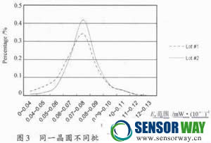 (3)發(fā)射器輻射強(qiáng)度及其空間分布上的變化晶片位置對(duì)發(fā)射器輻射強(qiáng)度及在空間分布有影響。在設(shè)計(jì)條件下,晶片位于發(fā)射器透鏡的中心線上。但在發(fā)射器的生產(chǎn)制造過程中,固晶(die_attach)和封膠(encapsulation)這兩道工序都可能使晶片偏離中心線,而封膠過程造成的偏離一般會(huì)更大。圖3為同一晶圓(wafer)不同批次(lot)發(fā)射器輻射強(qiáng)度的分布。由圖可見,批次1輻射強(qiáng)度在0.07~0.08 mW/10°范圍內(nèi)發(fā)射器的比例為34.2%,而批次2輻射強(qiáng)度在相同范圍內(nèi)的比例為41.8%。由于發(fā)射器輻射強(qiáng)度的測試與發(fā)射器在光電傳感器中的使用條件一般并不相同,輻射強(qiáng)度在空間分布的變化有可能導(dǎo)致在相同條件下,裝配測試得到的高輻射強(qiáng)度發(fā)射器的光電傳感器,其輸出電流反而比裝配測試得到的低輻射強(qiáng)度發(fā)射器的光電傳感器低。另外,通常情況下用于填充反射杯和覆蓋晶片的硅膠的折射率與封膠用的環(huán)氧樹脂(epoxy)的折射率十分接近,故硅膠與環(huán)氧樹脂交界面的形狀對(duì)發(fā)射器的輻射強(qiáng)度分布的影響很小。但若兩者有一定差別,則交界面的形狀會(huì)對(duì)發(fā)射器的輻射強(qiáng)度分布產(chǎn)生影響,這種情況下控制點(diǎn)膠工序中所用硅膠的量相同或相近十分重要,以便使不同發(fā)射器硅膠與環(huán)氧樹脂交界面的形狀保持一致,避免由此引起發(fā)射器輻射強(qiáng)度在空間分布的變化。