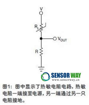 當(dāng)精度要求提高到±0.1℃時(shí),溫度范圍就要折衷到更小的范圍(小于100℃),此時(shí)可以用熱敏電阻。與RTD類(lèi)似,熱敏電阻的電阻值也是隨溫度而變化。熱敏電阻通常會(huì)接成一個(gè)電阻分壓器結(jié)構(gòu),其中另一只電阻與熱敏電阻有相同的標(biāo)稱(chēng)值(25℃室溫下的阻值)。熱敏電阻的一端接至電源,另一端接另一只電阻,然后接地(圖1)。探測(cè)溫度時(shí),測(cè)的是分壓器中點(diǎn)的電壓?梢灶A(yù)計(jì),在25℃時(shí)的電阻為+V/2。如有偏差,則可以計(jì)算出熱敏電阻的阻值,并用一個(gè)查找表確定出被測(cè)的環(huán)境溫度。