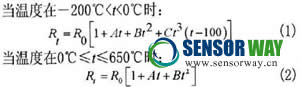 式中Rt為溫度在t℃時鉑熱電阻的電阻值;R0為0℃時鉑熱電阻的電阻值;A=3.968×10-3;B=-5.847×10-7;C=-4.22×10-12。在0~100℃范圍內(nèi),B值作用不明顯,Rt與R0近似成線性關(guān)系,即Rt=R0×(1+At)。