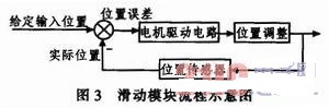 如圖3滑動模塊流程示意圖所示,本系統(tǒng)方案設(shè)計在傳輸系統(tǒng)和SMT生產(chǎn)設(shè)備的連接處,增設(shè)一個滑動裝置,主要由滑動板、滾珠和位置傳感器組成,形成了一個閉環(huán)控制,起到平衡作用。在生產(chǎn)過程中,由模塊裝置上的位置傳感器實(shí)時將實(shí)際位置信號反饋給系統(tǒng),與給定輸入位置信號相比較產(chǎn)生一個位置誤差信號,然后由這個誤差信號驅(qū)動電機(jī)運(yùn)轉(zhuǎn)進(jìn)行位置調(diào)整。當(dāng)設(shè)備平衡時,位置誤差為零,不進(jìn)行位置調(diào)整;當(dāng)傳輸機(jī)有偏斜時,位置誤差不為零,由它驅(qū)動電機(jī)運(yùn)轉(zhuǎn),使設(shè)備進(jìn)行一定的位置調(diào)整。通過這套裝置,消除由振動產(chǎn)生位置偏移、利于整個生產(chǎn)線的生產(chǎn)、增強(qiáng)各設(shè)備之間銜接。