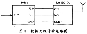 對于移動或便攜式數(shù)據(jù)采集測控系統(tǒng)而言,采用無線數(shù)據(jù)傳輸是一種較好的選擇方案。由北京捷麥通信器材有限公司生產(chǎn)的SA68D21DL無線數(shù)據(jù)報警收發(fā)模塊就是一款可在微機與微機之間,或微機與單片機之間進行全雙工遠距離無線通信的收發(fā)模塊。該模塊還可組成最多65535點的單發(fā)多收或多發(fā)單收形式無線局域網(wǎng)。其上位機硬件接線電路如圖3所示。