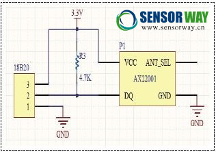 溫度采集單元主要有傳感器、處理器和電源組成,傳感器18B20負責區(qū)域內(nèi)溫度信息的采集和數(shù)據(jù)轉(zhuǎn)換,將溫度的傳感器信息經(jīng)過A/D轉(zhuǎn)換,得到數(shù)字信息,供處理器AX22001進行處理。其原理圖如圖1所示,其中ANT_SEL引腳接天線,用來傳送無線信號。