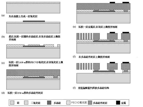 這個制程的第一個步驟是在晶圓上生成一層2.5μm厚的熱二氧化硅(圖2a)。第二步是用LPCVD沉積一個多晶硅層(多晶硅層1)。在這個多晶硅層上做版圖然后蝕刻,制成埋入式電連接結構,用于傳感器向外部傳遞電位和電容信號(圖2b)。根據(jù)器件的設計,這個多晶硅層還可用于制造薄多晶硅微加工器件的結構層。然后,用PECVD沉積一層1.6μm厚的二氧化硅層。這個PEVCD氧化層與2.5μm厚的熱二氧化硅構成一個4.1μm厚的復合氧化層,用作THELMA制程中的犧牲層。然后,在PECVD沉積氧化物層上做版圖和蝕刻,用作厚多晶硅器件的錨定區(qū),稍后制成錨定組件(圖 2c)。下一步,用外延沉積法沉積一層厚多晶硅 (圖2d)。這個層的厚度可以根據(jù)器件設計做相應的調(diào)整,厚度范圍是15μm到50μm。通過沉積、版圖和蝕刻工藝,制作一個連接傳感器的金屬導電層(圖2e)。隨后,用深反應離子蝕刻方法(DRIE)在厚多晶硅層上做圖和蝕刻,一直到底部的氧化層(圖2f)。DRIE方法準許在厚多晶硅層上制作縱橫比很大的結構。最后用氫氟酸蒸汽去除犧牲層,釋放多晶硅結構層(圖2f)。
