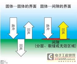 如果兩種材料之間存在間隙,則此位置不再是塑料-金屬界面,而是塑料-真空或者可能是塑料-空氣界面。由于后一材料不是固體,界面處的聲學(xué)特性發(fā)生了極大的變化,使傳回的回聲振幅極高(圖1),且大于兩種粘合良好的固體產(chǎn)生的回聲。一般>99.99%的脈沖超聲波將被反射,即便間隙僅有0.01 µm,工程師也會(huì)看到十分明亮的間隙區(qū)域。