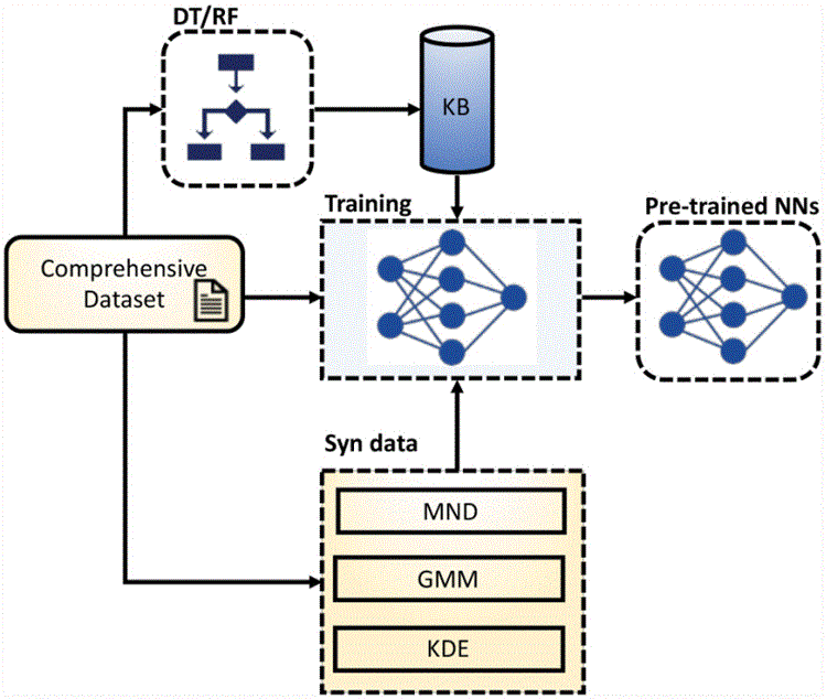 使用合成數(shù)據(jù)集(DT/RF:決策樹/隨機(jī)森林,NN:神經(jīng)網(wǎng)絡(luò),KB:知識庫)對 DNN 模型進(jìn)行預(yù)訓(xùn)練的示意圖。