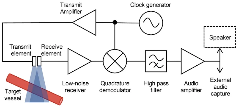 該設備測量頻移;接收回波的頻率與發(fā)射波束的頻率進行比較。頻率變化(稱為多普勒頻移)與朝向或遠離換能器的運動速度成正比。使用這種方法,貼片可以檢測到在兩個光束的重疊體積內(nèi)移動的任何地方的血液。