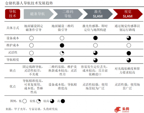 磁條導(dǎo)航與二維碼導(dǎo)航,具有維護成本高,路線固定導(dǎo)致靈活性相對較差的特點。視覺SLAM相對激光SLAM的技術(shù)成熟度較低,且對光線的依賴度較高,并且算法量大也是行業(yè)難點。