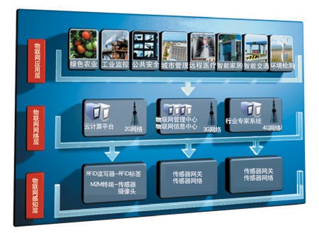 從技術(shù)架構(gòu)上來(lái)看,物聯(lián)網(wǎng)可分為三層:感知層、網(wǎng)絡(luò)層和應(yīng)用層。感知層由各種傳感器以及傳感器網(wǎng)關(guān)構(gòu)成,包括二氧化碳濃度傳感器、溫度傳感器、濕度傳感器、二維碼標(biāo)簽、RFID 標(biāo)簽和讀寫器、攝像頭、GPS等感知終端。感知層的作用相當(dāng)于人的眼耳鼻喉和皮膚等神經(jīng)末梢,它是物聯(lián)網(wǎng)獲識(shí)別物體,采集信息的來(lái)源,其主要功能是識(shí)別物體,采集信息,并且將信息傳遞出去。網(wǎng)絡(luò)層由各種私有網(wǎng)絡(luò)、互聯(lián)網(wǎng)、有線和無(wú)線通信網(wǎng)、網(wǎng)絡(luò)管理系統(tǒng)和云計(jì)算平臺(tái)等組成,相當(dāng)于人的神經(jīng)中樞和大腦,負(fù)責(zé)傳遞和處理感知層獲取的信息。應(yīng)用層是物聯(lián)網(wǎng)和用戶(包括人、組織和其他系統(tǒng))的接口,它與行業(yè)需求結(jié)合,實(shí)現(xiàn)物聯(lián)網(wǎng)的智能應(yīng)用。物聯(lián)網(wǎng)的行業(yè)特性主要體現(xiàn)在其應(yīng)用領(lǐng)域內(nèi),目前綠色農(nóng)業(yè)、工業(yè)監(jiān)控、公共安全、城市管理、遠(yuǎn)程醫(yī)療、智能家居、智能交通和環(huán)境監(jiān)測(cè)等各個(gè)行業(yè)均有物聯(lián)網(wǎng)應(yīng)用的嘗試,某些行業(yè)已經(jīng)積累一些成功的案例。