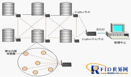 本系統(tǒng)是采用最先進(jìn)的ZigBee無線傳輸技術(shù)。在糧庫(kù)的不同地方分置溫濕度傳感器,溫濕度傳感器是采用無線傳輸,將現(xiàn)場(chǎng)測(cè)量到的數(shù)據(jù)通過無線電磁波,傳送給糧庫(kù)內(nèi)的讀寫器,讀寫器再通過無線中繼器,將數(shù)據(jù)無線傳輸給電腦,電腦將接受到的數(shù)據(jù)存儲(chǔ),并與系統(tǒng)設(shè)定的標(biāo)準(zhǔn)值比較。若現(xiàn)場(chǎng)值超出標(biāo)準(zhǔn)值,系統(tǒng)會(huì)報(bào)警告知管理人員,并會(huì)自動(dòng)的控制風(fēng)機(jī)等設(shè)備作降溫處理。
