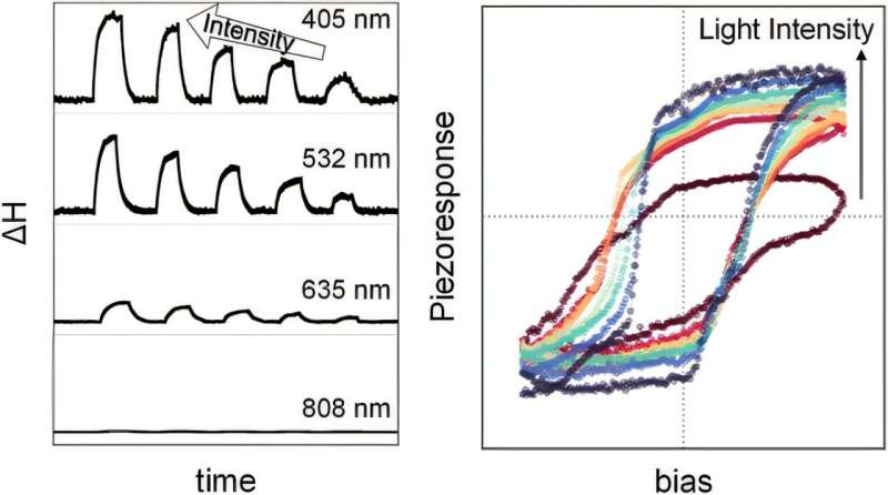 如今,該研究團隊已在無束縛的 BiFeO(一種多鐵性材料)薄膜中,成功觀測到可見光照射下的顯著光致伸縮效應(yīng)。