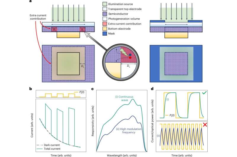 響應(yīng)度 / 外量子效率(EQE)表征面臨的挑戰(zhàn)。a 圖:左側(cè)為入射光束過填充現(xiàn)象,載流子產(chǎn)生區(qū)域超出標稱活性區(qū)域,延伸至特征尺寸為 DL 的外圍區(qū)域,導致響應(yīng)度 / EQE 測定不準確;右側(cè)為采用孔徑法實現(xiàn)響應(yīng)度 / EQE 的準確測定。b 圖:在器件承受多束功率為 Pi (t) 的光脈沖期間,監(jiān)測隨時間變化的暗電流對準確測量響應(yīng)度 / EQE 至關(guān)重要。c 圖:調(diào)制頻率選擇不當對連續(xù)波光響應(yīng)度 / EQE 表征的調(diào)制測量結(jié)果產(chǎn)生影響。d 圖:c 圖所示效應(yīng)的時域示意圖,上方為合適的調(diào)制頻率,可通過調(diào)制測量準確測定連續(xù)波光響應(yīng)度 / EQE;下方為不合適的調(diào)制頻率。來源:《自然光子學》(2025)。DOI:10.1038/s41566-025-01759-1