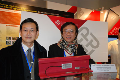 由香港理工大學研發(fā)的“精密鐵路監(jiān)測系統” 是全球首套智能鐵路監(jiān)測網絡,是利用先進光纖光柵傳感器,把機械應變轉換成反射光波長的變化。通過監(jiān)測光波長的變動,可對機械應變進行測量,技術能應用于機械和土木工程項目如車輛、橋梁、高樓、水堤等,監(jiān)測其結構的變動情況,讓管理單位能及早進行維修、檢視工作。2004年,“光纖光柵鐵路監(jiān)測系統”在瑞士日內瓦舉行的第三十二屆國際發(fā)明及創(chuàng)新技術與產品展覽中榮獲金獎, 而在2009年亦獲得中國國際工業(yè)博覽會的金獎。