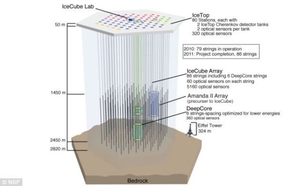 冰立方陣列由放進很深的冰洞里的眾多傳感器串組成。靠近冰面的IceTop由兩層探測器組成。圖的右下角繪制的巴黎埃菲爾鐵塔的圖像,是用來與這個探測器進行對比,讓它的大小更加一目了然。