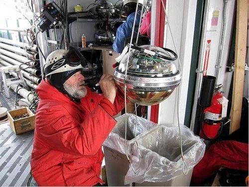 冰立方建設(shè)小組的成員在測試傳感器(圖左部分顯露),另一位科學(xué)家正在將一個(gè)單獨(dú)的傳感器掛在電纜上。天文臺(tái)區(qū)別于兩個(gè)輔助探測器的主探測器被安置在體積為一平方公里的冰層中,而南極是唯一能找到如此巨大冰塊的地方。美國國家科學(xué)基金會(huì)表示,天文臺(tái)的規(guī)模越大就越靈敏,因?yàn)槊娣e的增加意味著中微子和水核的碰撞就越有可能被觀測到。