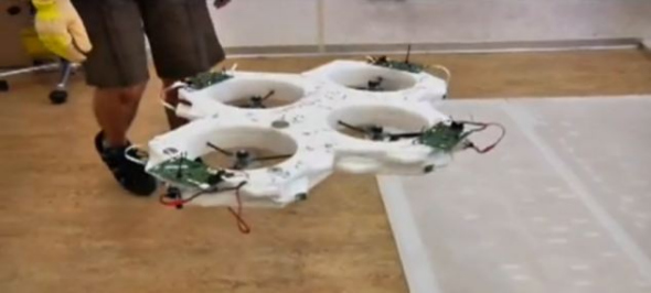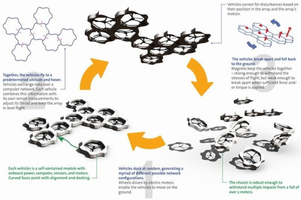 單個四軸飛行器都具有固定螺旋槳,可以驅(qū)動它們升空,由這種方式驅(qū)動的飛行總是飄忽不定,而且不受控制。不過,一旦接在一起,這些相對簡單的小機器人立即就變成復雜的多螺旋槳系統(tǒng),可以協(xié)調(diào)飛行。每個無人機組都配備了馬達、電腦和傳感器。除了微型螺旋槳導管系統(tǒng),它們下方還有幾個小輪子,令其可以在地面爬行尋找對方重組。