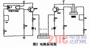 具體電路設計見圖2。以圖左半部分為例,當TCRT5000下面無黑線時,紅外線能正常反射,接收管可以接收到信號并導通,此時NPN三極管導通,指示燈亮并向單片機提供高電平。反之當光電傳感器下面有黑線時,NPN三極管關斷,單片機得到低電平信號。通過調節(jié)102的可調電阻,可以調整發(fā)射強度,下面100Ω電阻作為防燒毀的限流電阻。這是一張簡化的原理圖,圖中左半部的電路同樣可以視需要的尋跡器個數(shù)擴展任意多個。本設計用五只TRCT5000來尋跡,對應輸給單片機插口的7-3號腳,這樣可分別接避障模塊和路程檢測模塊。