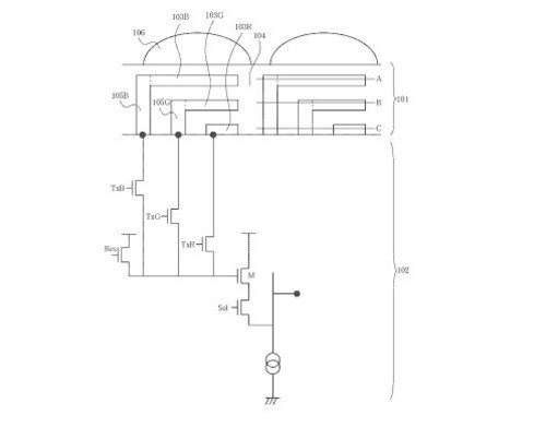 據(jù)悉,該專(zhuān)利技術(shù)細(xì)節(jié)公布時(shí)間為2010年6月30日。這款新型傳感器采用了目前的較為流行的背照式結(jié)構(gòu),從上至下分別為藍(lán)、綠、紅色吸收層,其上排列有光電轉(zhuǎn)換元以接受光信號(hào)。