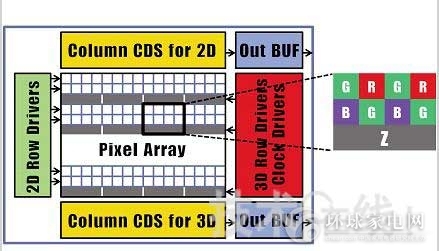 Z像素的大小為2.25μm×9.0μm,相當于四個RGB單個像素的面積。Z像素與RGB像素相鄰,位于下側(cè)。在像素區(qū)域的上下方分別設(shè)置了用于RGB像素和用于Z像素的列線(Column)CDS電路。另外,由于有Z像素而缺失的RGB像素信息可以通過圖像處理算法進行插值補償。