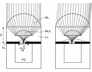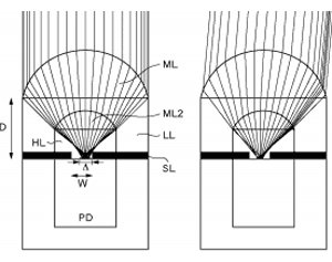 一般微透鏡折射率為1.6,低折射層的折射率為1.45,佳能此項(xiàng)新技術(shù)使用的高折射層的折射率達(dá)到了2.3。新技術(shù)通過在內(nèi)層鏡片和光電二極管之間嵌入高折射層,將所有入射光線都聚焦在透光間隙內(nèi),從而達(dá)到提高光線收集能力和相位差檢測對焦速度的目的。
