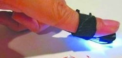 加拿大科技人員本月研發(fā)出了一個名為“魔指”(Magic Finger)的裝置,只要把它戴在手指頭上,你就可以讓任何表面變成一個觸摸屏,從而滑動使用。據(jù)悉,該裝置配備了一個微型攝像頭和光量傳感器,以識別服務并檢測用戶手指的移動。把“魔指”的尼龍指環(huán)套在手指上后,你可以使用一些手勢來操作電腦了。