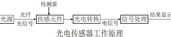隨著工藝水平的提高,光纖技術(shù)目前相對成熟。光纖傳感器即為應(yīng)用光纖傳輸?shù)幕驹斫M合的一個廣電感應(yīng)系統(tǒng)。通常的光纖傳感系統(tǒng)由光源、光導(dǎo)纖維、光傳感元件,光調(diào)制元件和信號處理部分組成[3]。其工作原理如下圖所示:光源發(fā)出的光經(jīng)過光導(dǎo)纖維進入光傳感元件,而在光傳感元件中受到周圍環(huán)境場的影響而發(fā)生變化的光再進入光調(diào)制機構(gòu),由其將傳感元件測量的參數(shù)調(diào)制成幅度、相位、偏振等信息,這一過程稱為光電轉(zhuǎn)換過程,最后利用微處理器進行信號分析。