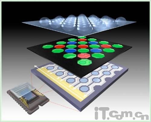 索尼編號為2010-161200的新專利項,申請于2009年1月8日,2010年7月22日公布。與傳統(tǒng)正方形傳感器相比,這種蜂窩式傳感器具有以下特點: