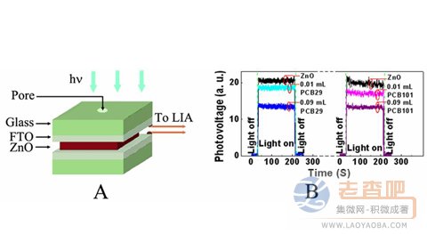 該傳感器的結(jié)構(gòu)非常簡(jiǎn)單,由兩片導(dǎo)電玻璃和中間夾著的一薄層多孔氧化鋅粉末構(gòu)成(圖 A)。在光照面一側(cè)的導(dǎo)電玻璃中間有一個(gè)小圓孔,是PCBs進(jìn)入氧化鋅粉末層的通道。通過(guò)鎖相放大器與導(dǎo)電玻璃相連來(lái)測(cè)量其SPV。該系統(tǒng)的靈敏度較高,可以檢測(cè)出微弱的SPV信號(hào)變化。之所以采用多孔氧化鋅粉末,是為了增強(qiáng)對(duì)PCBs的富集作用,從而提高檢測(cè)的靈敏度。由于該傳感器在光照后幾秒鐘便可獲得穩(wěn)定的SPV信號(hào)(圖B),因而具有較短的分析時(shí)間,有望用于PCBs的快速檢測(cè)。