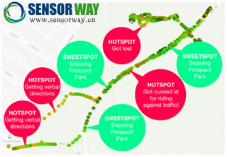 開發(fā)人員希望通過傳感器得到的思維地圖可以幫助用戶創(chuàng)建出紅點(diǎn)更少的路線,或者提醒他們紅點(diǎn)的位置,讓他們做好準(zhǔn)備,從而減輕行車時(shí)的壓力與不安。而且,綜合多個(gè)用戶的思維地圖,城市規(guī)劃者可以設(shè)計(jì)出更適合騎車者的自行車道。