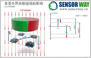 圖2 微分傳感技術(shù)可使設(shè)備不受雜散磁場的影響。圖中下部為4個霍爾傳感器。