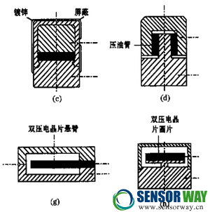 鐵電雙壓電晶片的加速度傳感器常常是彎曲型的,如圖5 (d)所示,它采用一個懸臂元件。加速度通常是施于雙壓電晶 片的平面上,而且除了雙壓電晶片的自重外一般沒有慣性質 量。把這種設計進行改進,把晶片固定到一個薄金屬圓盤上, 中心用螺栓支承,該結構已被成功地使用了。在加速度作用下 晶片撓曲像一把張開的傘如圖5(h)。