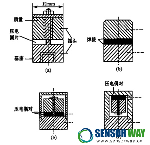 寬頻段微型加速度傳感器,是把鈦酸鋇圓晶片放在傳感器 底座和慣性質量之間,并用夾緊的方法安裝起來,如圖5(a)。 近代,F(xiàn)arnborough皇家航空飛行器研究中心生產(chǎn)了一種焊接結 構傳感器,并用包鋅的環(huán)氧樹脂外罩來防潮和靜電屏蔽如圖5 (b)和圖5(c)。但是對這種外罩能顯著地增加阻尼的希望未 能奏效。若采用圖5(d)所示的管狀元件和圖5(f)所示的倒置 型,則可避免底部結構中的應變直接傳遞到敏感元件上去。