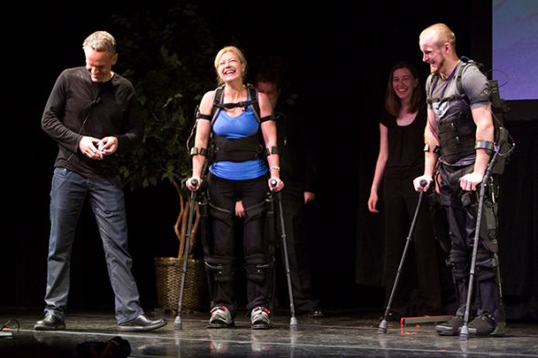 在近日舉行的一場發(fā)布會上,癱瘓已18年的截癱患者阿曼達(dá)-博克斯特爾演示了“eLEGS”外骨骼系統(tǒng)的使用方法。博克斯特爾表示,“每走一步,我的信心就增強一倍。這是一種真正的解放。我常年坐在輪椅上,感覺處處低人一頭。現(xiàn)在,我可以看到整個世界!