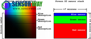 簡單來說,這項技術有點像適馬Foveon X3傳感器的衍生版本。Foveon X3是將藍、綠、紅三色層按照波長自上而下排列,TFD同樣也利用了不同波長(色彩)光線在硅材料里的傳播特性。但不同的地方在于,TFD用硅材料替換掉了原先的標準RGB陣列,并把不同深度的色彩數(shù)據(jù),分多層記錄下來。