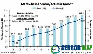 IC Insights預(yù)期,MEMS組件(包含傳感器與驅(qū)動器)市場規(guī)模在2014年可達到80億美元,成長率是14%;至于明年,該機構(gòu)預(yù)期MEMS市場將進一步成長16%,營收規(guī)模92億美元。在2013至2018年間,預(yù)期該市場平均年復(fù)合成長率為11.7%,整體規(guī)模將在2018年達到122億美元;至于MEMS組件出貨量則成長速度更快,在同一期間平均年成長率可達14%,而這也是MEMS組件平均價格出現(xiàn)大幅下降的主要原因。