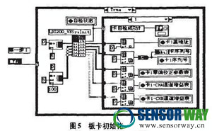 該模塊的功能是實現(xiàn)檢驗并初始化板卡,然后設置系統(tǒng)基本參數(shù)來控制硬件系統(tǒng),既可以無觸發(fā)采集,又可以單通道觸發(fā)采集數(shù)據(jù)。在啟動采集之前,首先對LDl200初始化,確定自檢成功或提示“無LDl200卡”,程序如圖5所示。