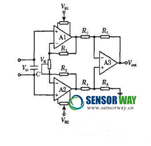 在許多需要數(shù)字采集的系統(tǒng)中,傳感器輸出的模擬信號都很微弱,必須通過1個模擬放大器對其進行一定倍數(shù)的放大,才能滿足采集卡對輸入信號電平的要求,這種情況下,就需要采用信號調理電路對傳感器輸出的信號量進行放大。信號調理電路使輸出電壓與輸入電壓成正比,它的核心是1個具有電容負反饋、且輸入阻抗極高的高增運算放大器。差動儀表放大器如圖2所示。