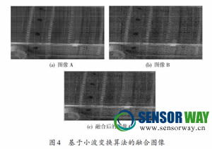 基于小波變換算法的圖像融合的結(jié)果如圖4 所示,圖像C 是圖像A 和圖像B 融合后的圖像,這里小波基系數(shù)用sym6、分解層數(shù)是3層、低頻取平均、高頻取窗口系數(shù)加權(quán)。