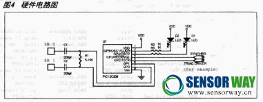 在圖4硬件電路圖中包含兩個傳感器按鈕。其技巧是對于讀傳感器SB0:GP0設(shè)置為輸入,GP1設(shè)置為輸出;而對于讀SB1:GP0設(shè)置為輸出,GP1設(shè)置為輸入。GP4,5連接至LED,指示傳感器按鈕的狀態(tài),PIC12C508其他引腳在此不討論,它們可用做為SYNCRO輸入和TRIAC DRIVER輸出。