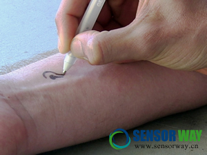 生物傳感器過皮膚讀取血糖指數(shù),并通過藍(lán)牙設(shè)備傳出結(jié)果。一支筆里的墨水可以寫滿500張血糖傳感條。