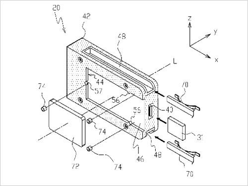 從設(shè)計(jì)圖來(lái)看,尼康可換傳感器相機(jī)也是采用傳感器模塊的設(shè)計(jì)概念來(lái)更換相機(jī)主要部件,不過(guò)尼康的設(shè)計(jì)與理光GXR設(shè)計(jì)不同,尼康可換傳感器模塊并沒(méi)有將鏡頭一起集合起來(lái)?紤]到更換安裝的便利性以及防塵性,相機(jī)采用了插槽式的設(shè)計(jì),并在相機(jī)一側(cè)劃分了簡(jiǎn)單地導(dǎo)軌設(shè)計(jì)以方便安裝。而更換的CCD或是CMOS組建更是被類(lèi)似玻璃的材質(zhì)包覆以防止灰塵落日和意外損壞。